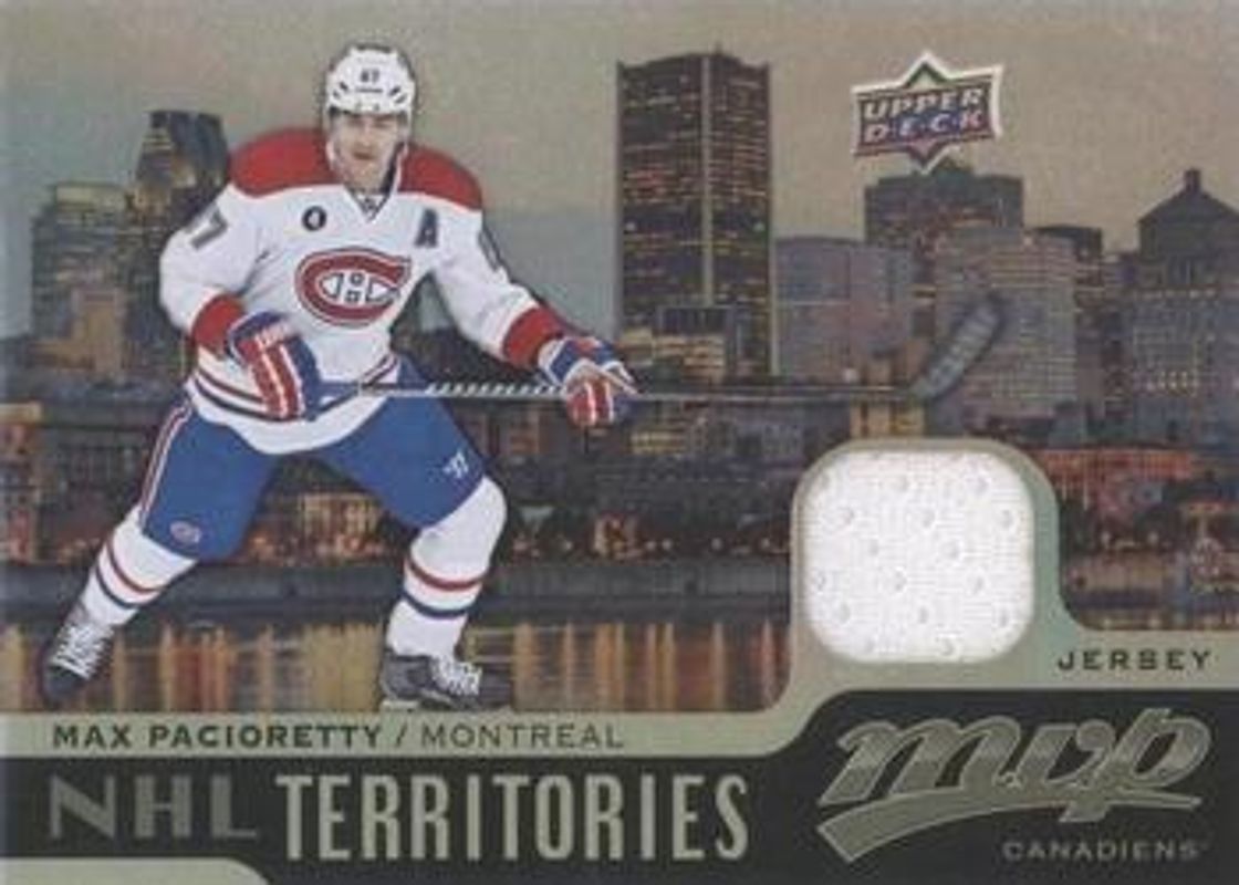The Max Pacioretty 2015 Upper Deck MVP #TM-MP NHL Territory Materials card is 1 of 13 Max Pacioretty's card variations in the 2015 Upper Deck MVP set being tracked by Sports Card Investor, including #217 Base, #140 Base, #140 Colours & Contours, #140 Green (e Pack), and #140 Silver Script.