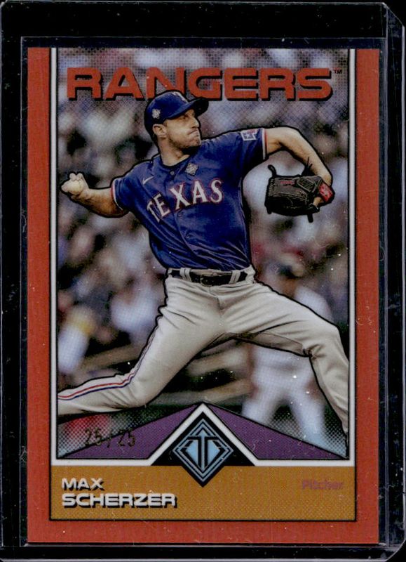 The Max Scherzer 2024 Topps Transcendent #45 Orange Refractor /25 card is 1 of 10 Max Scherzer's card variations in the 2024 Topps Transcendent set being tracked by Sports Card Investor, including Base, Black Refractor /10, Red Refractor /5, Superfractors /1, and Image Variations.
