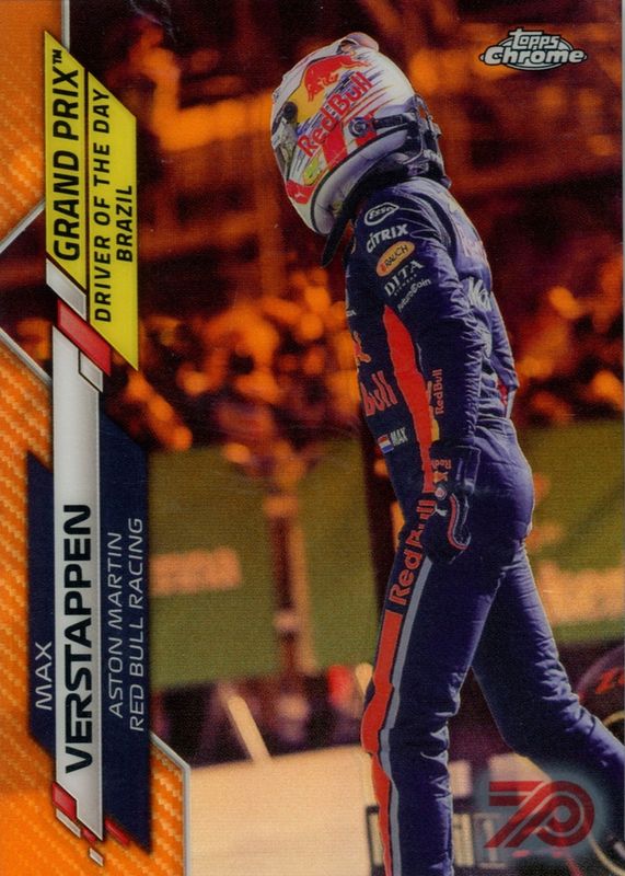 The Max Verstappen 2020 Topps Chrome Formula 1 #173 Grand Prix Driver of the Day - 70th Anniversary Orange Refractor (Brazil) Rookie card in Raw condition has not changed in price in the last 30 days and was last sold for $74.99 .