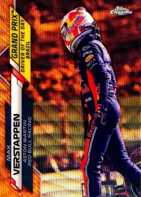 Best Prices Available For Sale of Max Verstappen 2020 Topps Chrome Formula 1 #173 Grand Prix Driver of the Day - Orange Wave Refractor /25 (Brazil)