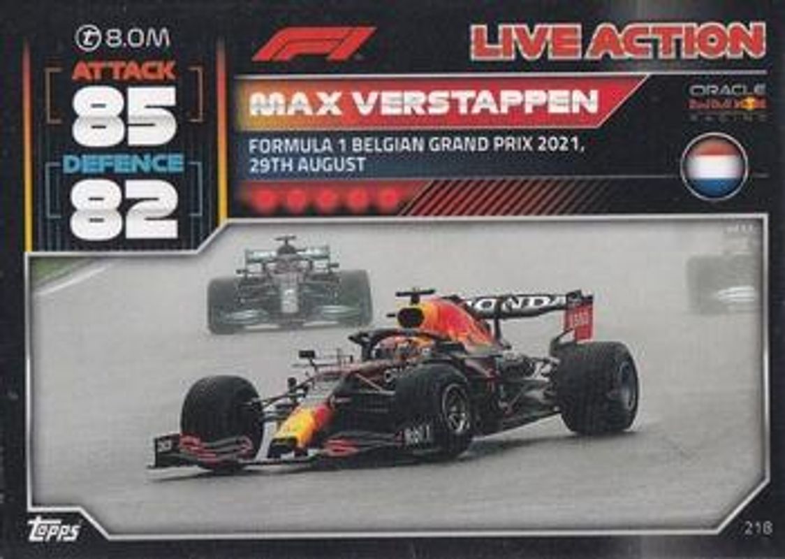 The Max Verstappen 2022 Topps Turbo Attax Formula 1 #218 Base card is 1 of 60 Max Verstappen's card variations in the 2022 Topps Turbo Attax Formula 1 set being tracked by Sports Card Investor, including #185 Base, #14 Base, #15 Base, #166 Base, and #177 Base.