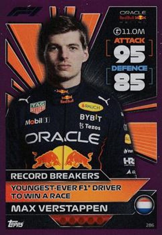 The Max Verstappen 2022 Topps Turbo Attax Formula 1 #286 Mirror Foil Pink card is 1 of 60 Max Verstappen's card variations in the 2022 Topps Turbo Attax Formula 1 set being tracked by Sports Card Investor, including #185 Base, #14 Base, #15 Base, #166 Base, and #177 Base.