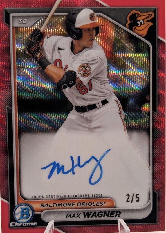 The Max Wagner 2024 Bowman #CPA-MW Chrome Prospect Auto - Red Wave Refractor /5 card in Raw condition has not changed in price in the last 30 days and was last sold for $112.50 .
