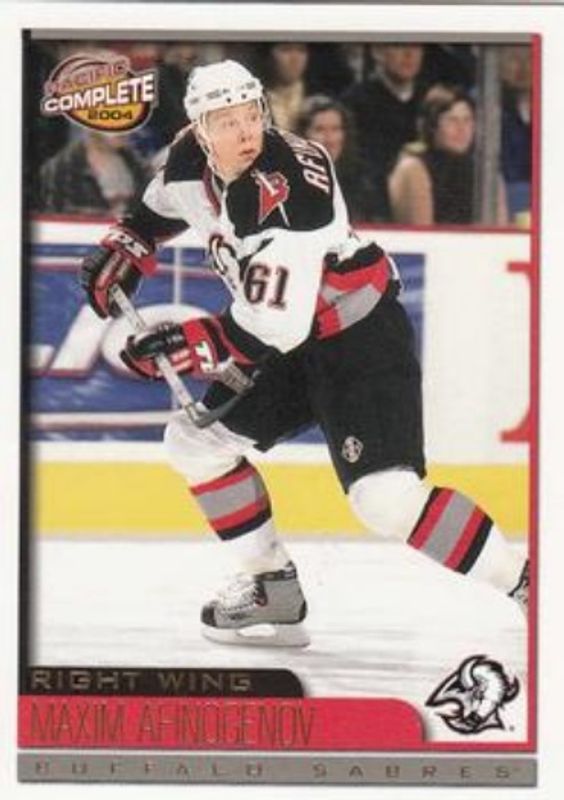 The Maxim Afinogenov 2003 Pacific Crown Royale #252 2003 Pacific Complete card is 1 of 3 Maxim Afinogenov's card variations in the 2003 Pacific Crown Royale set being tracked by Sports Card Investor, including 2003 Pacific Complete - Red /99, and Pacific Complete 2004 Toronto Spring Expo /1.