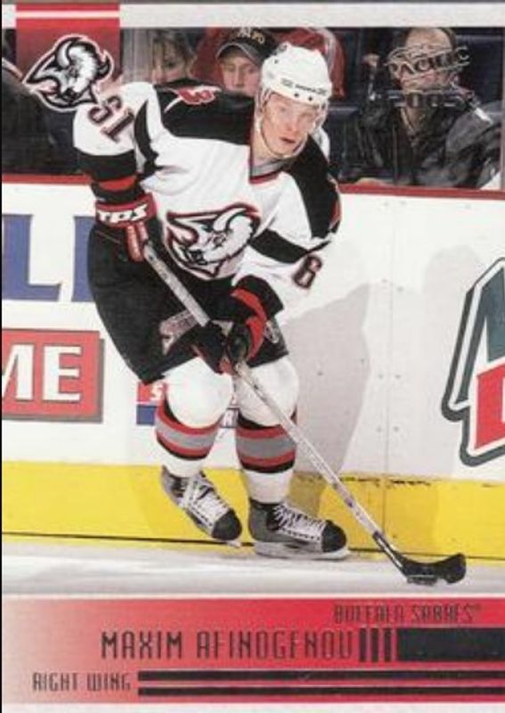 The Maxim Afinogenov 2004 Pacific #28 Base card is 1 of 3 Maxim Afinogenov's card variations in the 2004 Pacific set being tracked by Sports Card Investor, including Red, and Blue /250.