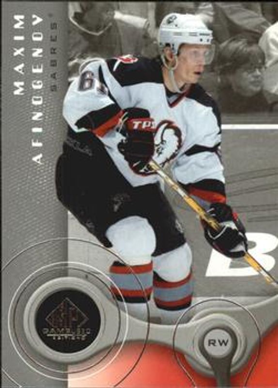 The Maxim Afinogenov 2005 SP Game Used #14 Base /999 card is 1 of 7 Maxim Afinogenov's card variations in the 2005 SP Game Used set being tracked by Sports Card Investor, including Gold /25, Game Gear /100, Auto Draft /20, Game Gear Autographs /10, and Autographs /5.