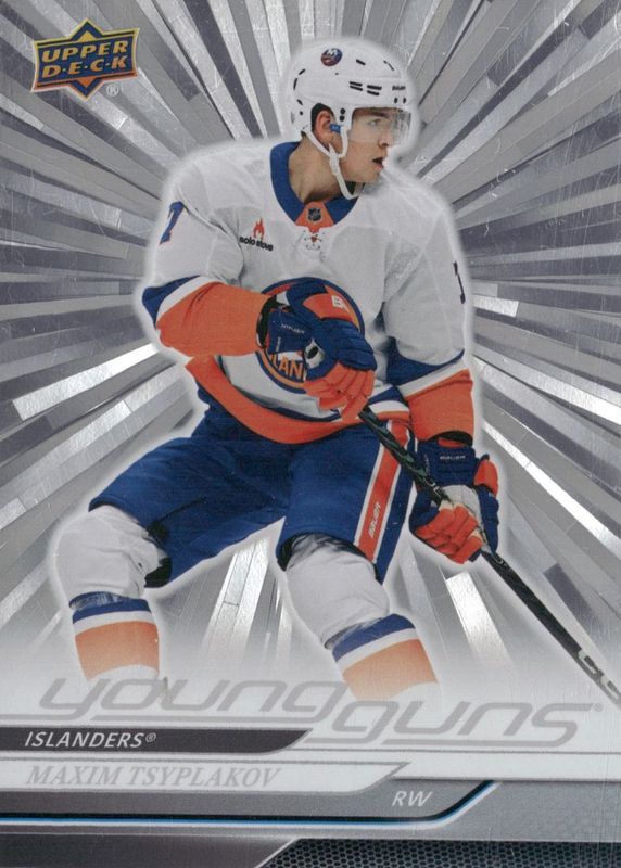 This card is 1 of 8 Maxim Tsyplakov's card variations in the 2024 Upper Deck set being tracked by Sports Card Investor, including Young Guns Base, Young Guns - Clear Cut, Young Guns - Deluxe /250, Young Guns - UD Exclusives /100, and Young Guns - Outburst Red /25.