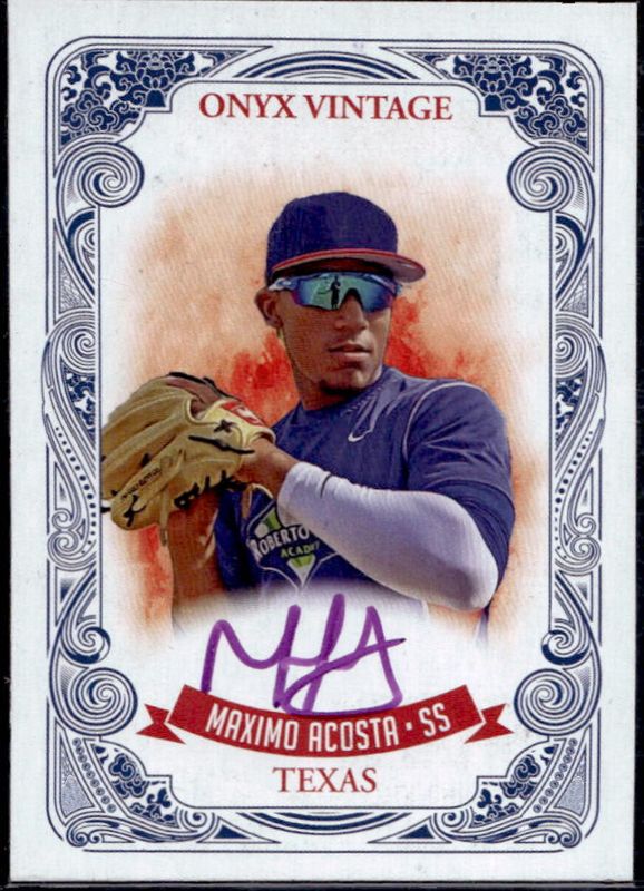The Maximo Acosta 2021 Onyx Vintage #VAMA Autographs Blue card is 1 of 5 Maximo Acosta's card variations in the 2021 Onyx Vintage set being tracked by Sports Card Investor, including Base, Autographs Red, Autographs Purple /100, and Autographs Black /5.