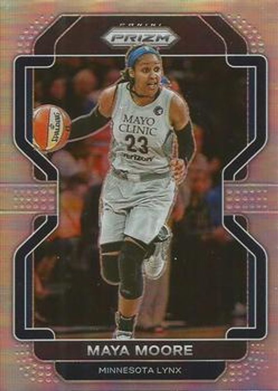 The Maya Moore 2022 Prizm WNBA #100 Silver card is 1 of 77 Maya Moore's card variations in the 2022 Prizm WNBA set being tracked by Sports Card Investor, including #64 Base, #169 Base, #100 Base, #100 Green, and #64 Green.