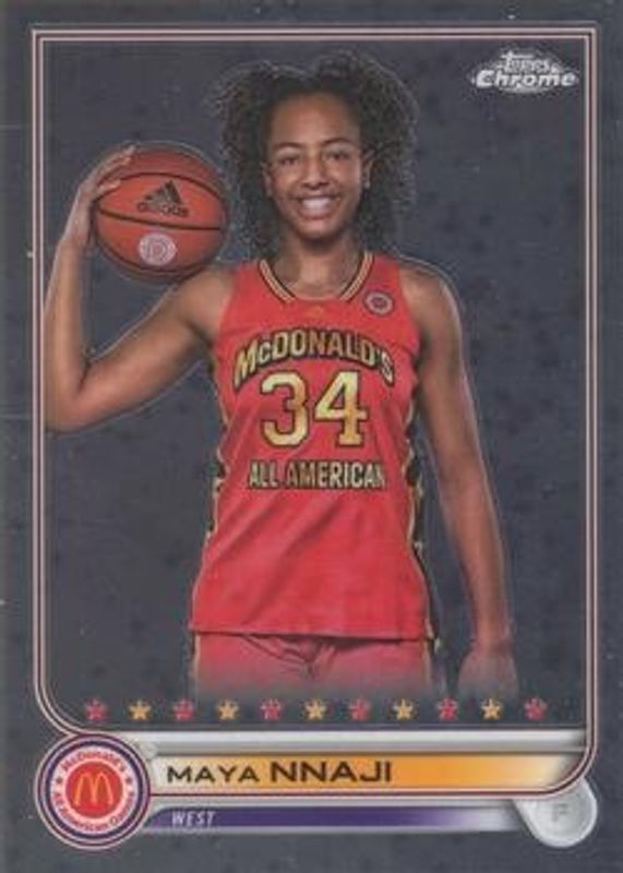 The Maya Nnaji 2022 Topps Chrome McDonald's All-American #95 Base card is 1 of 61 Maya Nnaji's card variations in the 2022 Topps Chrome McDonald's All-American set being tracked by Sports Card Investor, including #47 Base, #47 Logo Refractor, #95 Logo Refractor, #95 RayWave Refractor, and #47 RayWave Refractor.