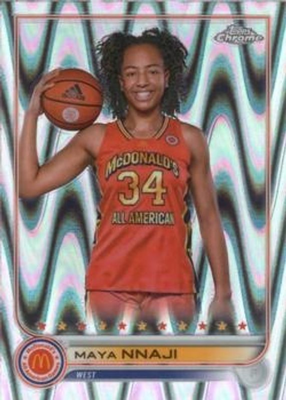 The Maya Nnaji 2022 Topps Chrome McDonald's All-American #95 RayWave Refractor card is 1 of 61 Maya Nnaji's card variations in the 2022 Topps Chrome McDonald's All-American set being tracked by Sports Card Investor, including #95 Base, #47 Base, #47 Logo Refractor, #95 Logo Refractor, and #47 RayWave Refractor.