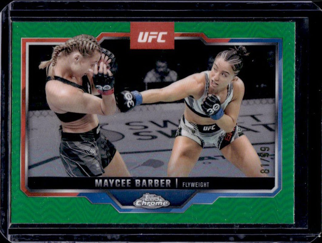 The Maycee Barber 2025 Topps Chrome UFC #187 Green Refractor /99 card is 1 of 77 Maycee Barber's card variations in the 2025 Topps Chrome UFC set being tracked by Sports Card Investor, including Base, Geometric Refractor, Negative Refractor, Prism Refractor, and Purple Refractor.