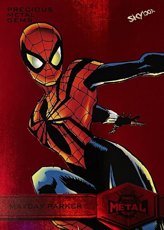 The Mayday Parker 2021 Skybox Marvel Metal Universe Spider-Man #150 Precious Metal Gems Red (High Series) /90 card in Raw condition has not changed in price in the last 30 days and was last sold for $54.00 .