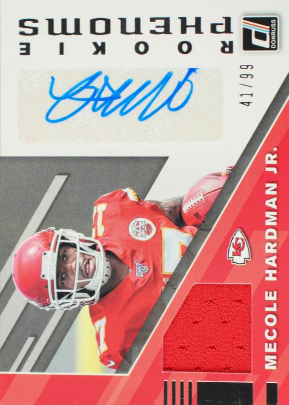 The Mecole Hardman Jr. 2019 Donruss #RPJ-20 Rookie Phenoms Jersey Autographs /99 card in Raw condition has not changed in price in the last 30 days and was last sold for $3.25 .