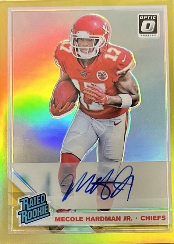 The Mecole Hardman Jr. 2019 Optic #175 Rated Rookie Autographs - Gold (/10) card in Raw condition has not changed in price in the last 30 days and was last sold for $57.27 .