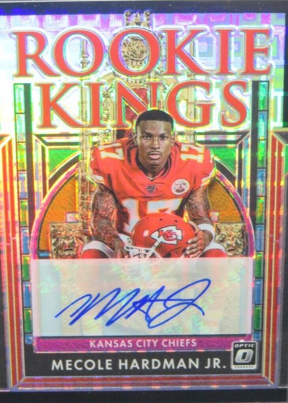 The Mecole Hardman Jr. 2019 Optic #RKA20 Rookie Kings Autographs - Black Pandora /10 card in Raw condition has not changed in price in the last 30 days and was last sold for $23.06 .