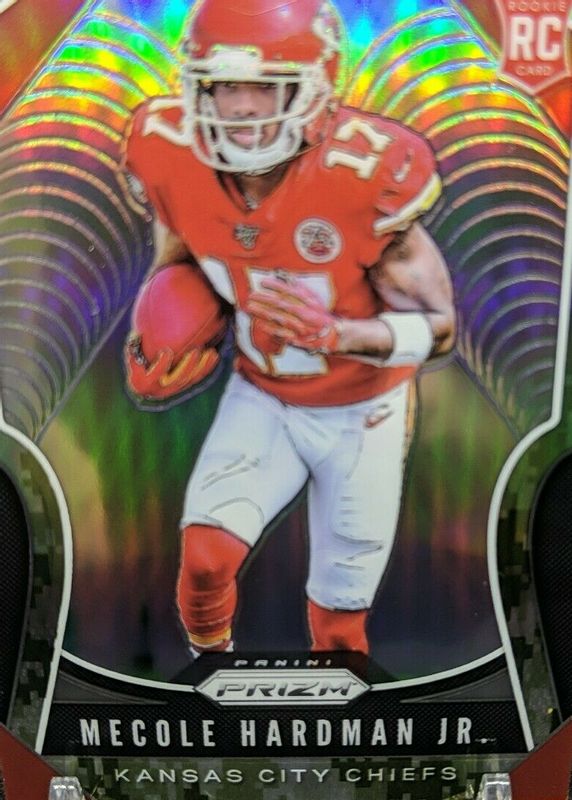 The Mecole Hardman Jr. 2019 Prizm #345 Camo /25 Rookie card in Raw condition has not changed in price in the last 30 days and was last sold for $20.50 .