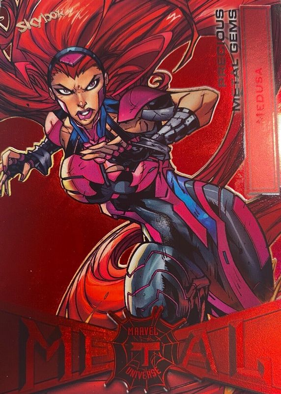 The Medusa 2021 Skybox Marvel Metal Universe Spider-Man #51 Precious Metal Gems Red /90 card in Raw condition has not changed in price in the last 30 days and was last sold for $36.19 .