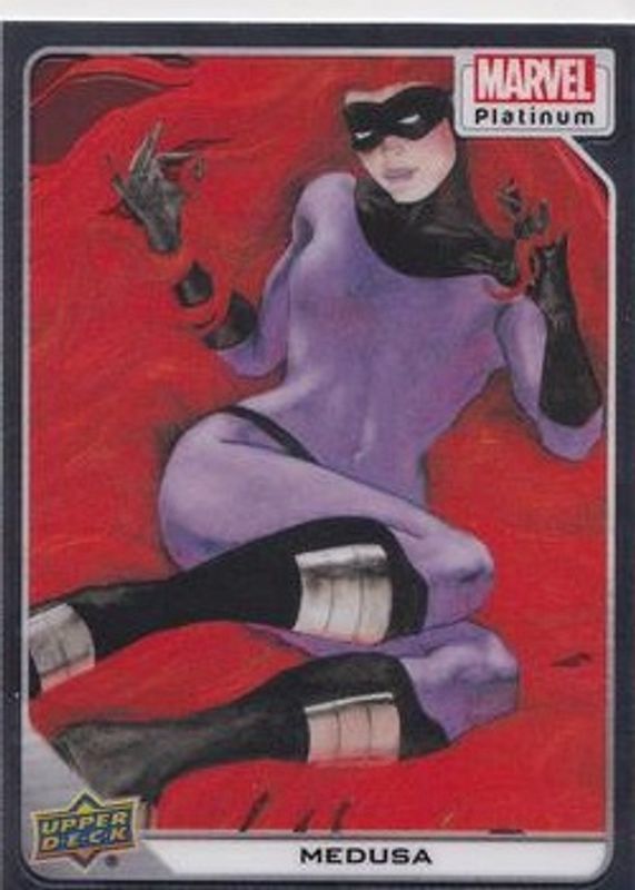 The Medusa 2023 Upper Deck Marvel Platinum #40 Base card is 1 of 71 Medusa's card variations in the 2023 Upper Deck Marvel Platinum set being tracked by Sports Card Investor, including #183 Base, #183 Black Rainbow, #40 Black Rainbow, #183 Blue Rainbow, and #40 Blue Rainbow.