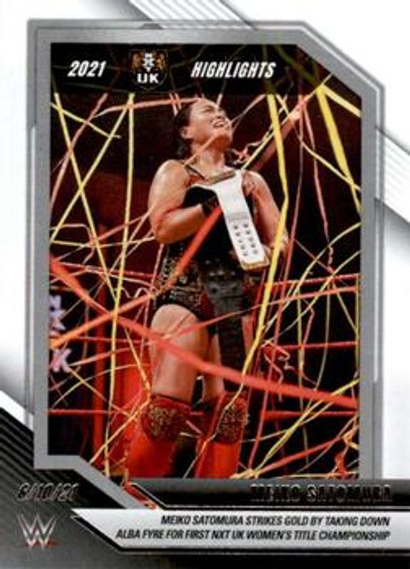 The Meiko Satomura 2022 Panini WWE NXT #46 2021 NXT Highlights card is 1 of 44 Meiko Satomura's card variations in the 2022 Panini WWE NXT set being tracked by Sports Card Investor, including Base, Green, Silver, Red /199, and Blue /149.