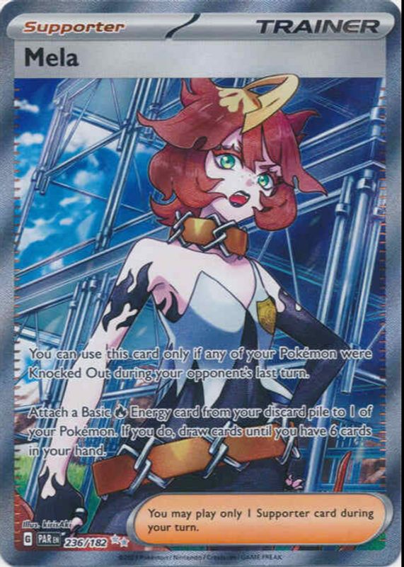The Mela 2023 Scarlet & Violet: Paradox Rift #236/182 Ultra Rare card in Raw TCG (Near Mint) condition has moved up $2.25 (+68.0%) in the last 30 days and was last sold for $5.56 .
