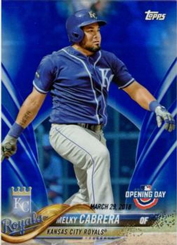 The Melky Cabrera 2018 Topps Opening Day #155 Opening Day Edition Blue Foil card is 1 of 10 Melky Cabrera's card variations in the 2018 Topps Opening Day set being tracked by Sports Card Investor, including Base, Purple, 5x7 /49, 5x7 Gold /10, and Opening Day 1 of 1 /1.