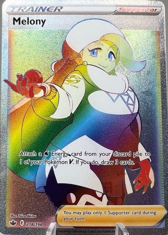 The Melony 2021 Sword & Shield: Chilling Reign #218/198 Holo (Secret) card in Raw TCG (Near Mint) condition has moved down -$3.51 (-46.8%) in the last 30 days and was last sold for $3.99 .