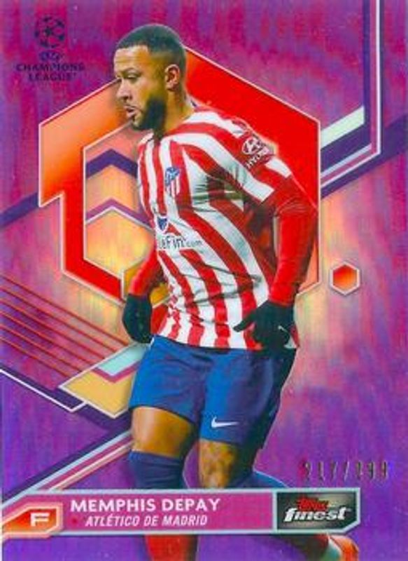 The Memphis Depay 2022 Topps Finest UEFA Club Competitions #121 Purple Refractor /299 card is 1 of 18 Memphis Depay's card variations in the 2022 Topps Finest UEFA Club Competitions set being tracked by Sports Card Investor, including Base, Refractor, Sky Blue Refractor /275, Blue Aqua Vapor Wave Refractor /250, and Purple Shimmer Refractor /199.