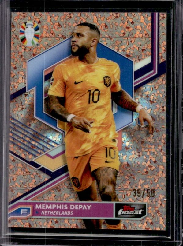 The Memphis Depay 2023 Topps Finest Road to UEFA Euro #52 Rose Gold Mini Diamond Refractor /50 card is 1 of 15 Memphis Depay's card variations in the 2023 Topps Finest Road to UEFA Euro set being tracked by Sports Card Investor, including Base, Refractor, Blue Aqua Vaporwave Refractor /250, Blue Refractor /150, and Green Speckle Refractor /125.