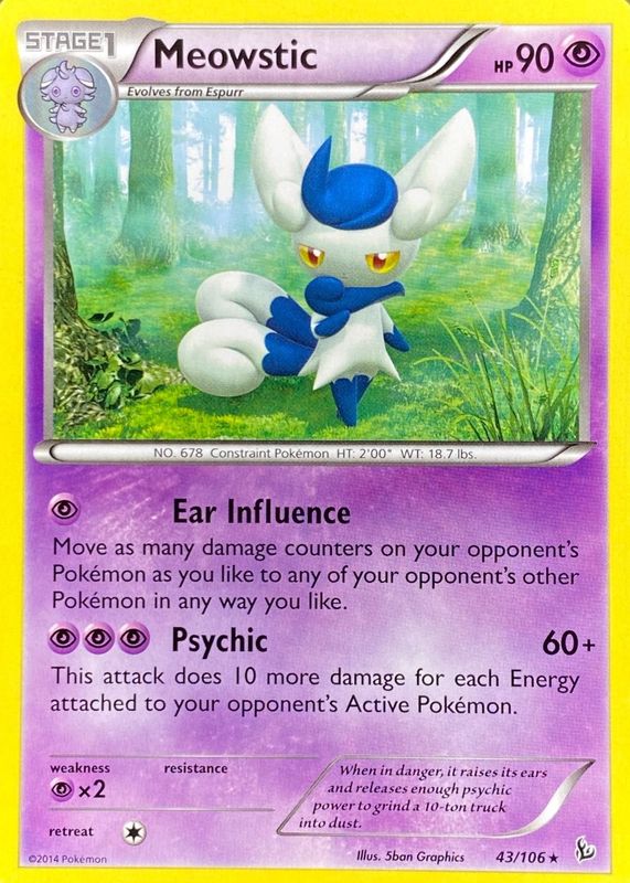 The Meowstic 2014 XY: Flashfire #043/106 Base card in Raw TCG (Near Mint) condition has not changed in price in the last 30 days and was last sold for $0.99 .