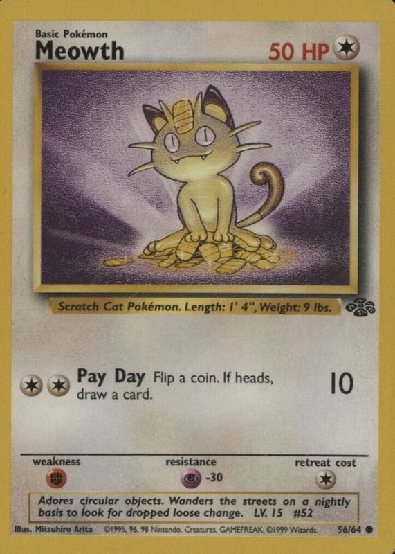 The Meowth 1999 Jungle #56/64 Unlimited card in Raw TCG (Near Mint) condition has moved up $0.51 (+25.6%) in the last 30 days and was last sold for $2.50 .