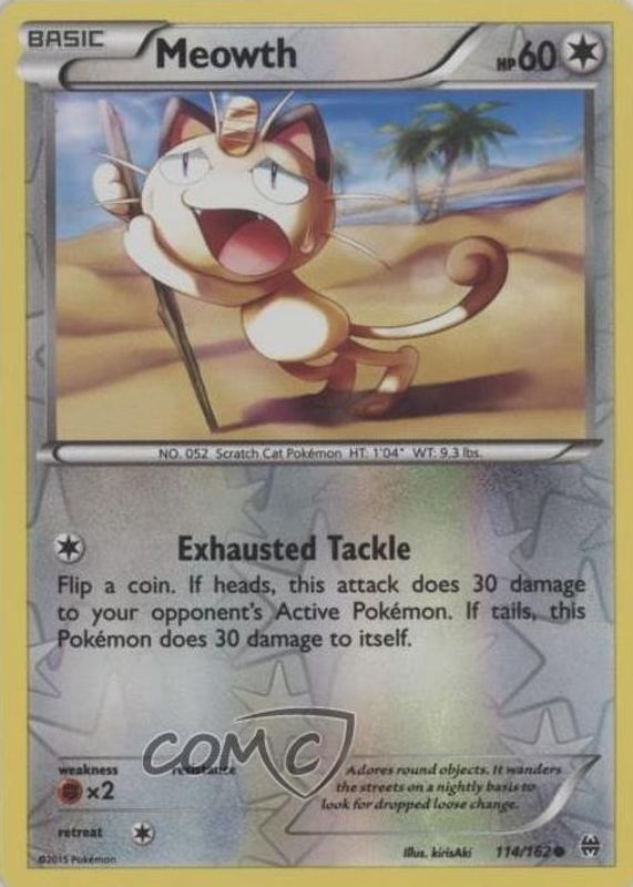 The Meowth 2015 XY: BREAKthrough #114/162 Reverse Holo card in Raw TCG (Near Mint) condition has moved up $1.44 (+40.4%) in the last 30 days and was last sold for $5.00 .