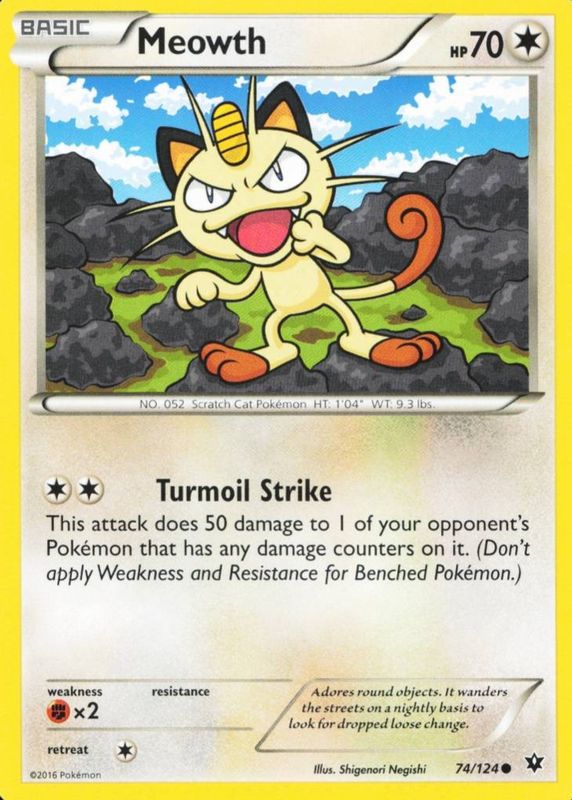 The Meowth 2016 XY: Fates Collide #074/124 Base card in Raw TCG (Lightly Played) condition has moved down -$0.38 (-17.5%) in the last 30 days and was last sold for $1.79 .