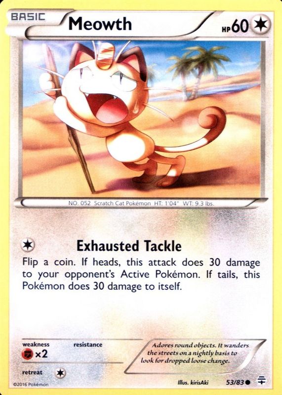 The Meowth 2016 XY: Generations #53/83 Base card in Raw TCG (Near Mint) condition has moved down -$0.98 (-44.1%) in the last 30 days and was last sold for $1.24 .