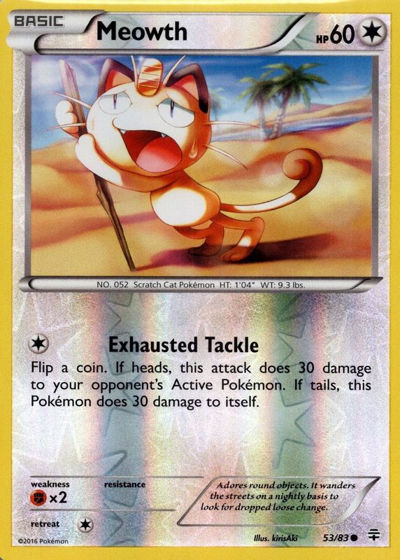 The Meowth 2016 XY: Generations #53/83 Reverse Holo card in Raw TCG (Near Mint) condition has moved down -$1.24 (-24.8%) in the last 30 days and was last sold for $3.75 .