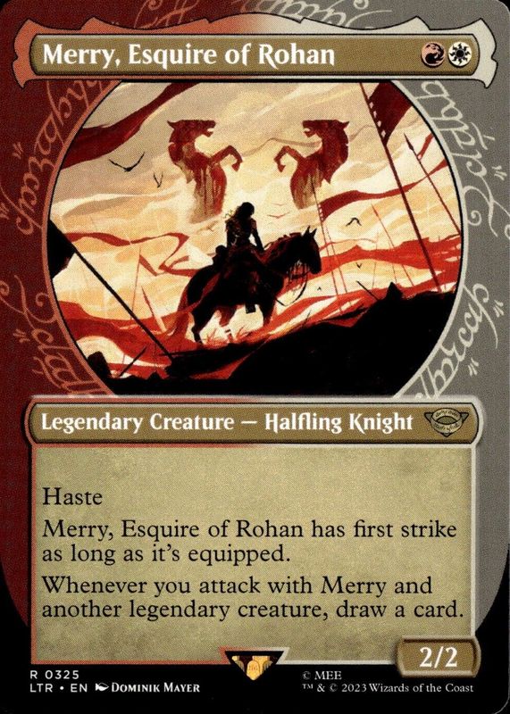 This card is 1 of 6 Merry, Esquire of Rohan's card variations in the 2023 The Lord of the Rings: Tales of Middle-Earth set being tracked by Sports Card Investor, including Base, Foil Borderless, Foil Showcase, Surge Foil Showcase, and Foil.