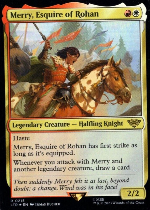 The Merry, Esquire of Rohan 2023 The Lord of the Rings: Tales of Middle-Earth #215 Foil card in Raw TCG (Near Mint) condition has not changed in price in the last 30 days and was last sold for $2.58 .
