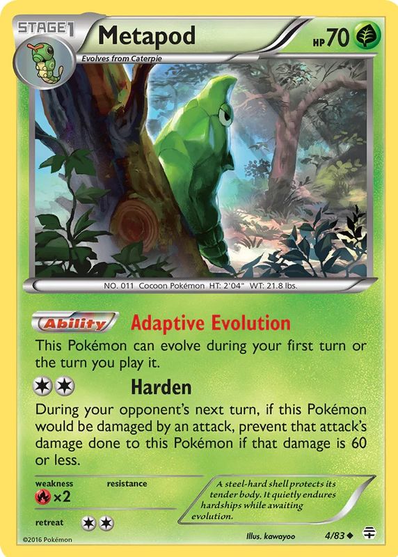 The Metapod 2016 XY: Generations #04/83 Base card in Raw TCG (Lightly Played) condition has not changed in price in the last 30 days and was last sold for $1.75 .