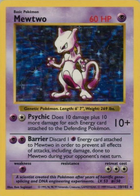 Pokémon 1999 Base Set Mewtwo 10/102 Shadowless Holo LP -