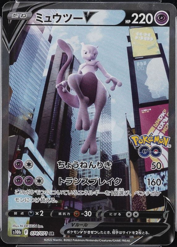 The Mewtwo V 2022 Japanese Sword & Shield: Pokemon GO #74/71 Super Rare (Full Art) card in Raw TCG (Lightly Played) condition has not changed in price in the last 30 days and was last sold for $39.59 .
