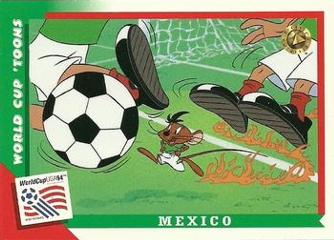 The Mexico 1994 Upper Deck World Cup Toons #9 Base card is 1 of 5 Mexico's card variations in the 1994 Upper Deck World Cup Toons set being tracked by Sports Card Investor, including #14 Base, #7 Base, #8 Base, and #Q3 World Cup Final Qualifiers Holograms.