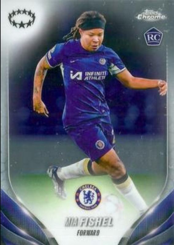 The Mia Fishel 2023 Topps Chrome UEFA Women's Champions League #39 Base Rookie card is 1 of 32 Mia Fishel's card variations in the 2023 Topps Chrome UEFA Women's Champions League set being tracked by Sports Card Investor, including Aqua Prism, Pulsar, Refractor, XI, and Purple Pulsar /299.