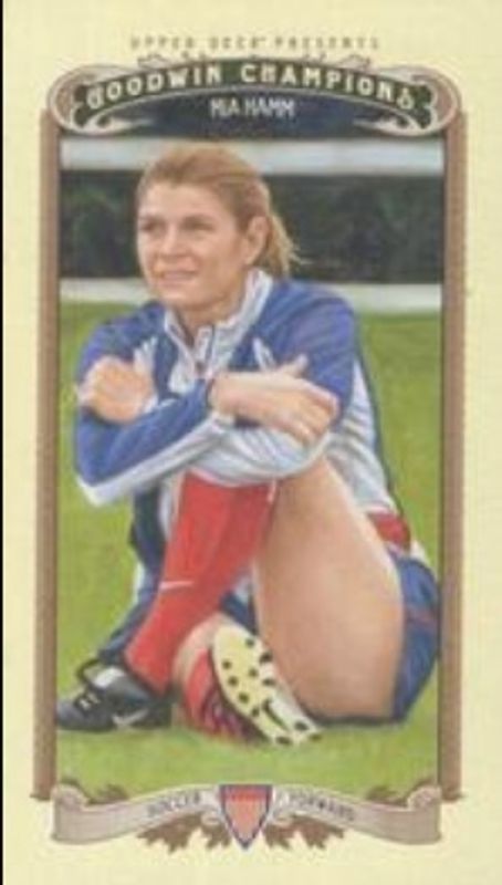 The Mia Hamm 2012 Upper Deck Goodwin Champions #67 Mini card is 1 of 12 Mia Hamm's card variations in the 2012 Upper Deck Goodwin Champions set being tracked by Sports Card Investor, including Base, Mini Foil, Mini Green, Mini Green Blank Backs, and Mini Foil Magician Red /12.