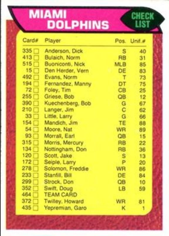 The Miami Dolphins 1976 Topps #464 Base card is 1 of 2 Miami Dolphins' card variations in the 1976 Topps set being tracked by Sports Card Investor, including Team Checklist.