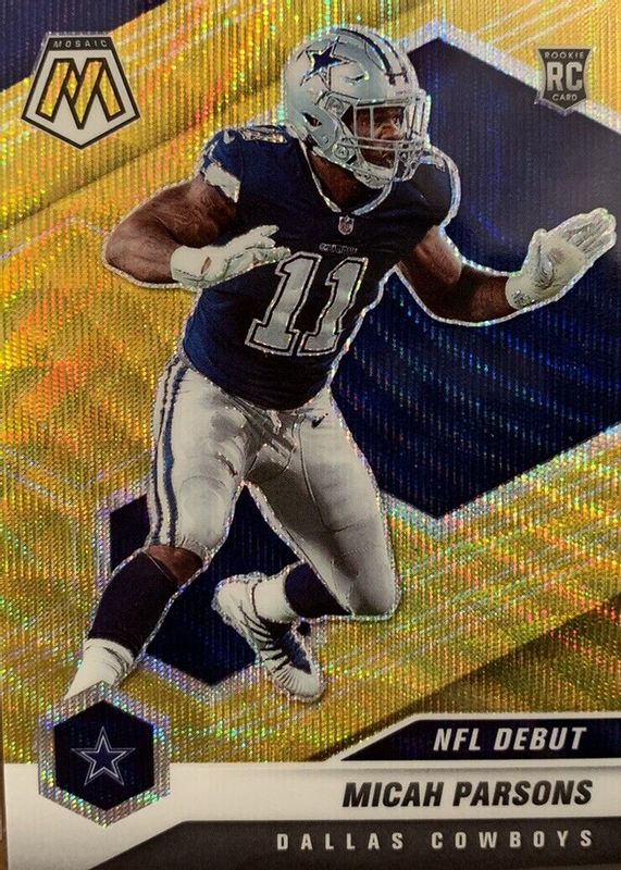 The Micah Parsons 2021 Mosaic #257 NFL Debut - Gold Wave /17 Rookie card in Raw condition has not changed in price in the last 30 days and was last sold for $72.56 .