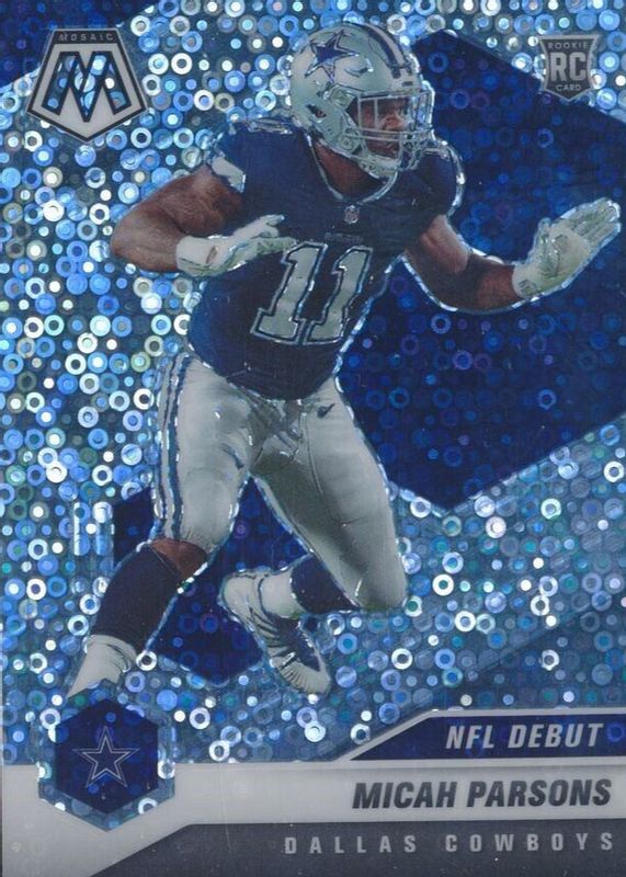 The Micah Parsons 2021 Mosaic #257 NFL Debut - No Huddle Rookie card in Raw condition has not changed in price in the last 30 days and was last sold for $3.50 .