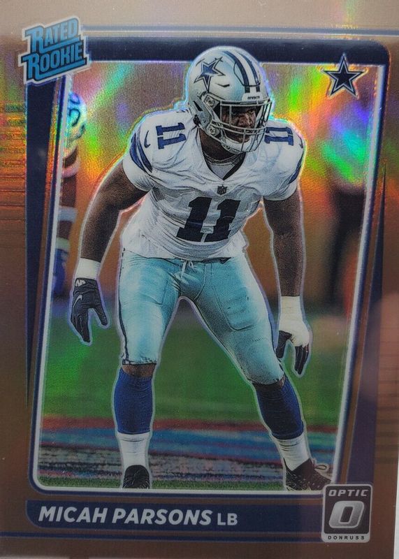 The Micah Parsons 2021 Optic #245 Bronze Rookie card in Raw condition has moved up $0.50 (+8.3%) in the last 30 days and was last sold for $6.50 .