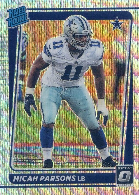 The Micah Parsons 2021 Optic #245 Wave /299 Rookie card in Raw condition has moved down -$20.50 (-51.3%) in the last 30 days and was last sold for $19.50 .
