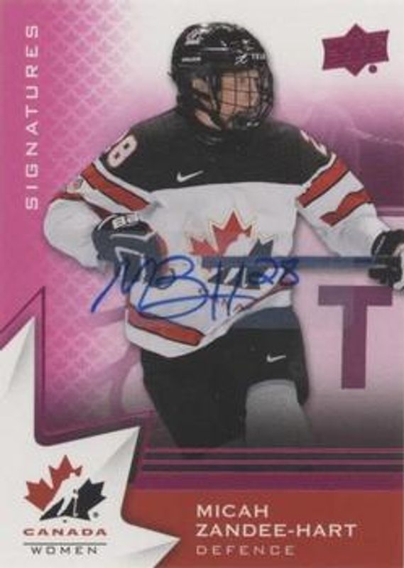 The Micah Zandee-Hart 2020 Upper Deck Team Canada Juniors #62 Autographs - Purple card is 1 of 13 Micah Zandee-Hart's card variations in the 2020 Upper Deck Team Canada Juniors set being tracked by Sports Card Investor, including Base, Exclusives /165, High Gloss /15, Blue, and Jerseys.