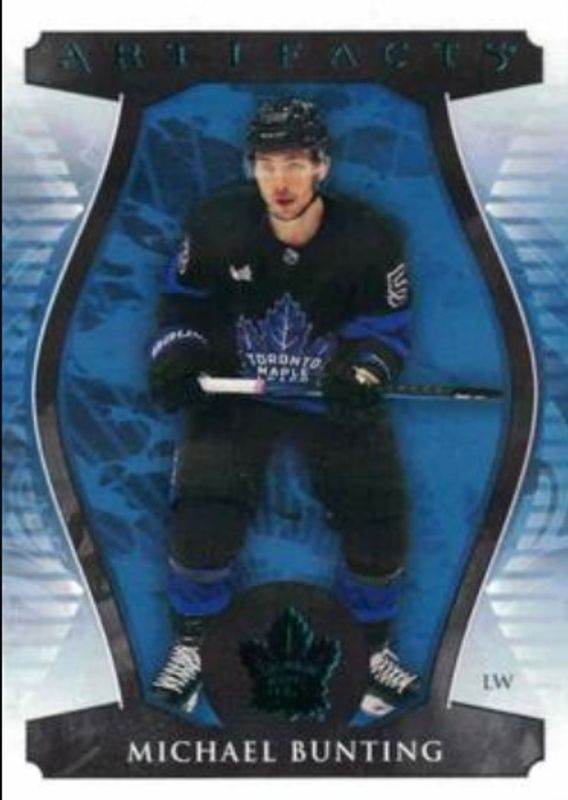 The Michael Bunting 2023 Upper Deck Artifacts #41 Turquoise card is 1 of 22 Michael Bunting's card variations in the 2023 Upper Deck Artifacts set being tracked by Sports Card Investor, including Base /999, Ruby /499, Copper /299, Royal Blue /199, and Emerald /99.